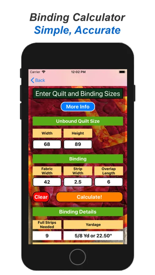 My Quilt Buddy offers easy-to-use quilting calculators to help quilters determine fabric requirements, # of pieces needed, etc. MQB includes a binding calculator, overall quilt design calculator, on-point settings triangle calculator and quilt sizes estimator. Our app also includes tips and techniques on popular quilt blocks and sewing suggestions.