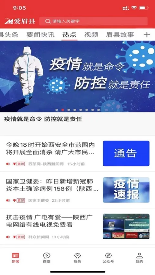 “爱眉县”手机APP作为眉县融媒体中心主办的“新闻+政务+服务”综合平台,是权威的舆论宣传主阵地。开设了新闻、直播、电视、广播、服务、“爱眉县”等栏目,整合了县域内网站、微信、微博、短视频等自媒体和部门、镇(办)、社区、村组政务服务资源。用户可通过客户端,第一时间了解眉县政治、经济、民生、服务等方面的最新动态,同时提供各种便民服务,还可参与实时互动,实现“一端在手,尽享智慧”。
