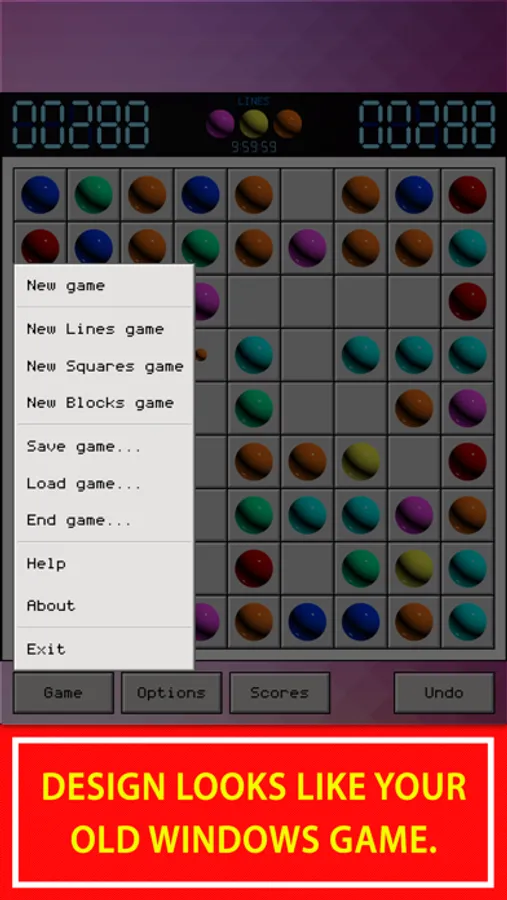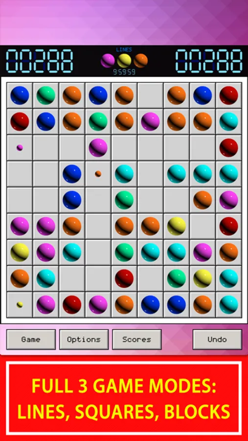 LINES 98 - Lines, Squares, Blocks based on Lines 98 classic game on desktop, is an addicting puzzle game where the player is challenged to keep the board empty by strategically eliminating balls of same color. There is 3 game modes: