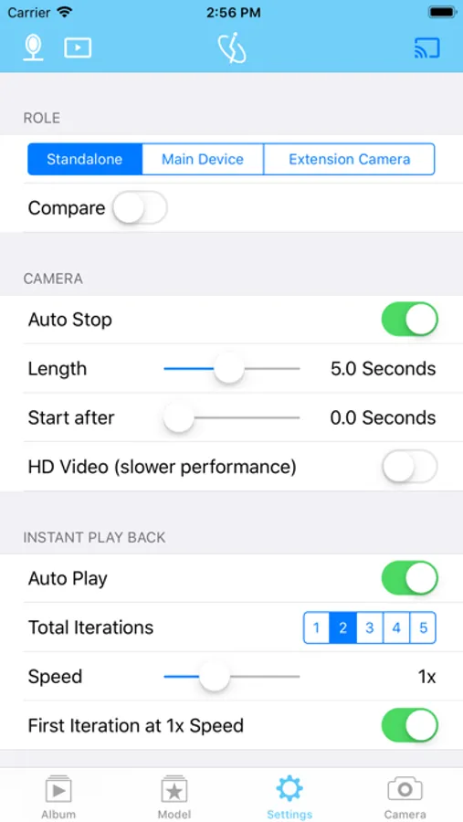 Linked Mode: Uses two devices with one set as the Main Device and the other set as the Extension Camera. In linked mode, you can take footage from both the Main Device and the Extension Camera and watch them side by side on one screen. Alternatively, you can opt to just take video from the Extension Camera and watch it by itself or compare it to a preset model swing (these options are especially useful for putting). Any videos taken in this mode will be displayed on the Main Device screen or casted to a Google Chromecast.