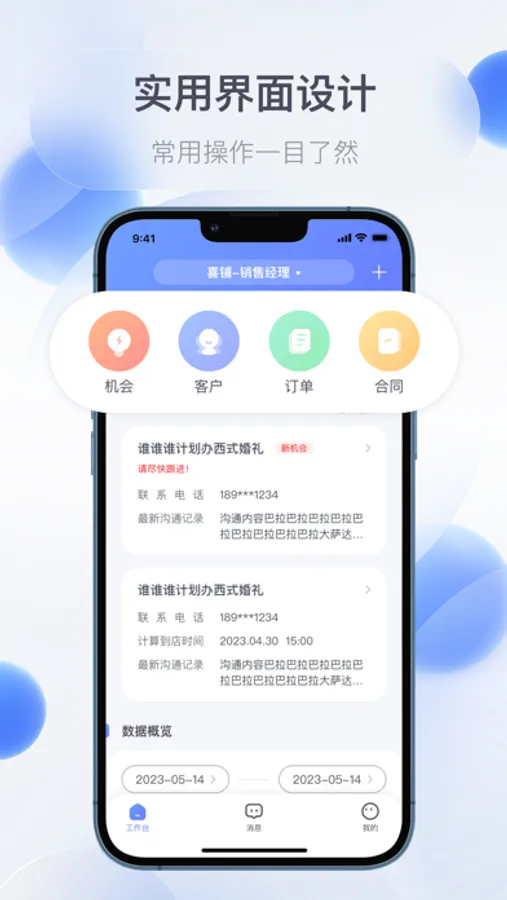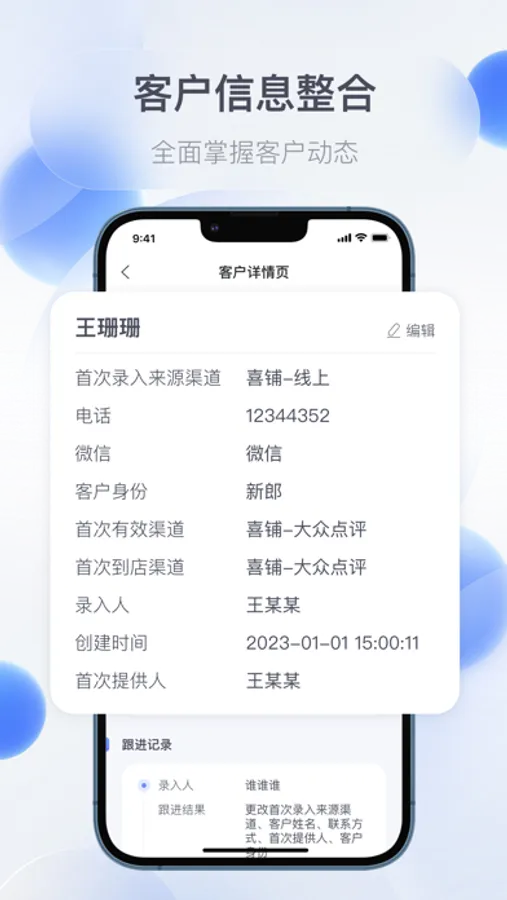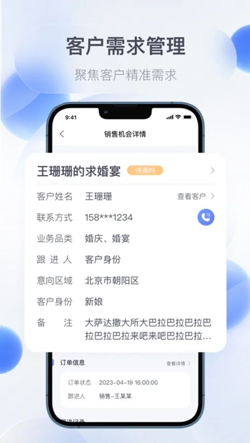 礼合CRM是一款针对婚礼行业的高效管理客户的工具,以客户为中心,进行精细化管理,完善的客户资料管理功能,对客户按销售阶段进行分类管理,方便查询,每个客户状态、历史跟进、需求信息一目了然,电脑和手机实时同步,24小时联系不中断 ,随时查阅客户信息、记录联系内容、完成销售业务,加速销售转化,提高销售业绩。