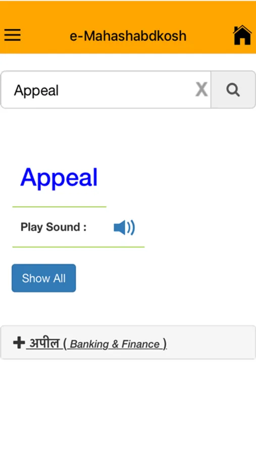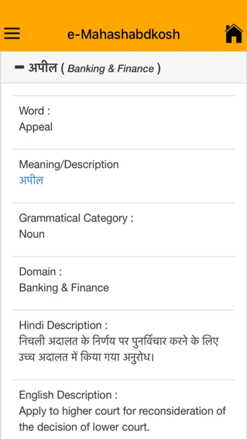 e-Mahashabdkosh is a domain based Bilingual and Bidirectional English-Hindi pronouncing dictionary. It contains the Hindi equivalent terms of English root words and vice-a-versa. The details of words include description in Hindi as well as in English, usages in Hindi and English, Pronunciation of the root word.