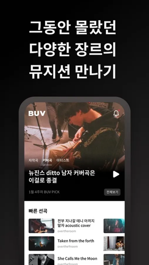 · 장르별, 주제별, 상황/분위기별로 BUV만의 특별한 필터 기능을 통해 더 쉽게 음악과 아티스트를 찾아보세요.