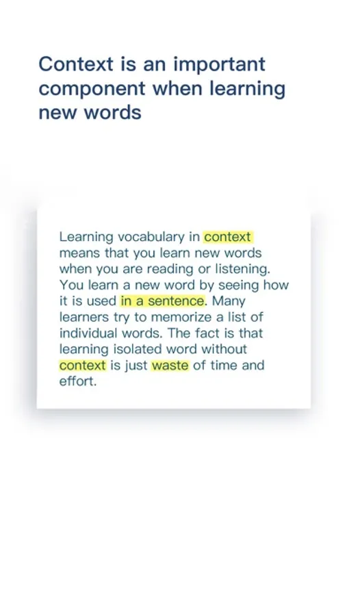 Learning vocabulary in context means that you learn new words when you are reading or listening. You learn a new word by seeing how it is used in a sentence. Many learners try to memorize a list of individual words.