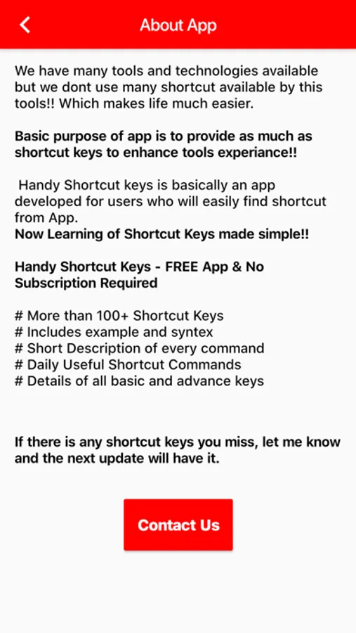 Basic purpose of app is to provide as much as shortcut keys to enhance tools experience!!