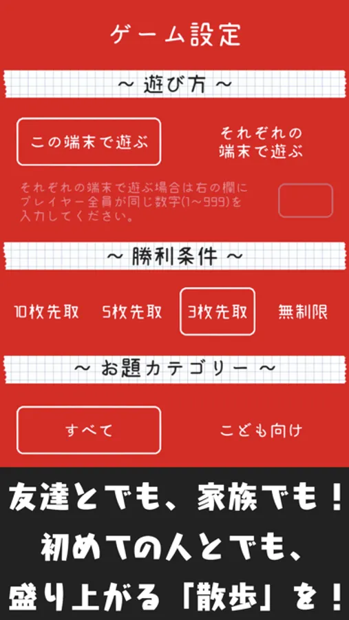外に出て、ぶらぶら歩く「散歩」を題材としたゲームで、2人~10人まで遊べます。