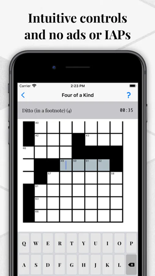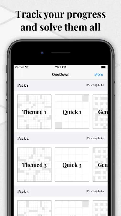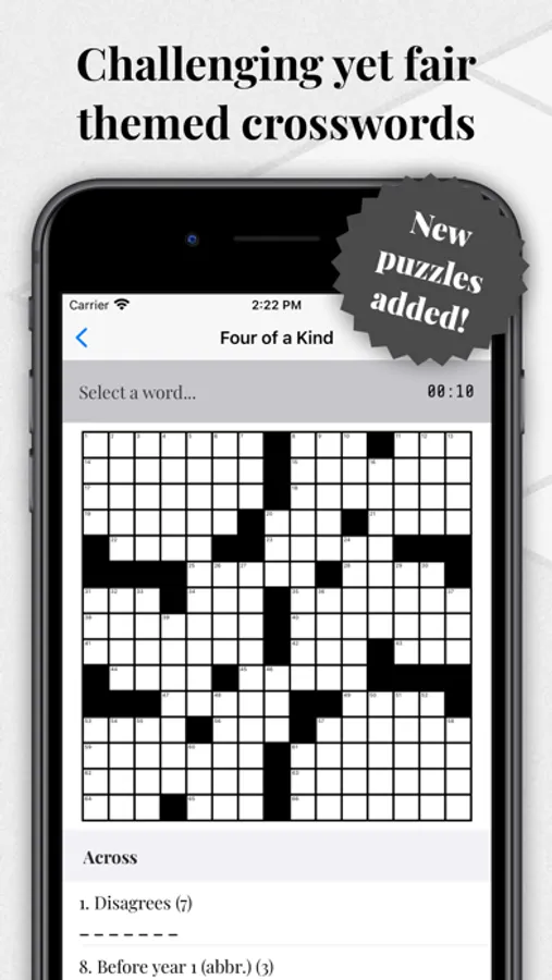 Created from scratch to deliver an authentic, challenging crossword experience, OneDown has 42 exclusive puzzles and over 1,500 clues, covering a wide variety of topics, from art to zoology.