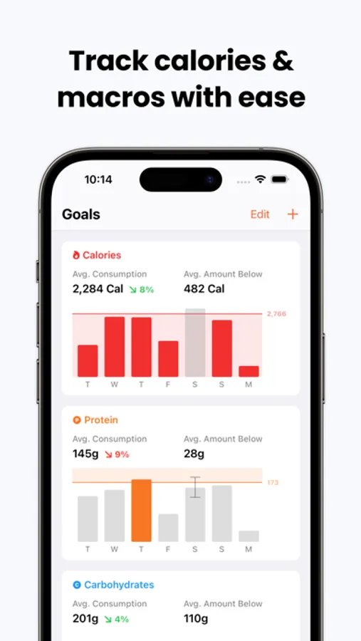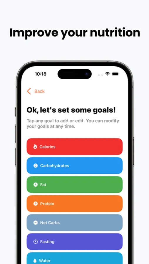 2. Set specific nutrition goals for calories, macros (protein, fat, carbohydrates), net carbs, cholesterol, fiber, sugars, water, alcohol, caffeine, and more.