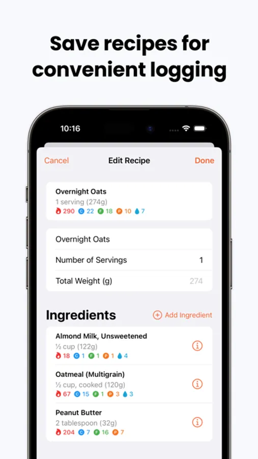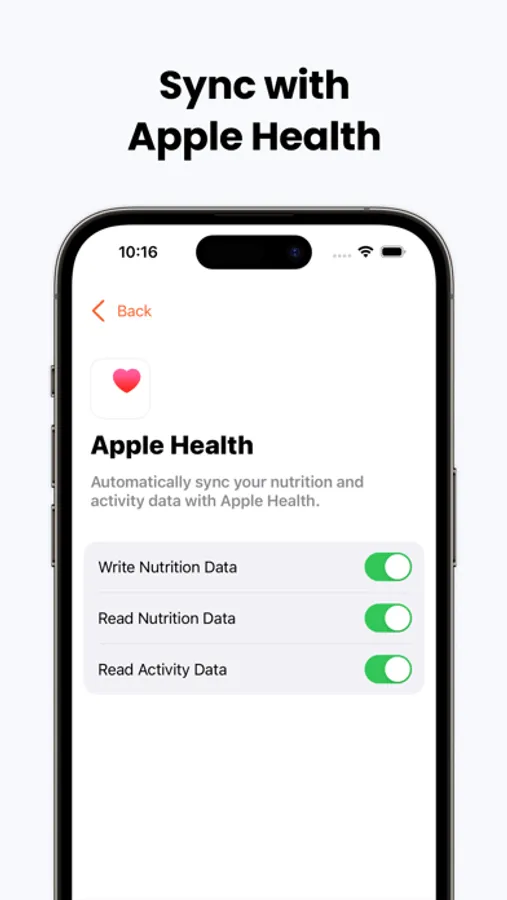 • Read and write nutrition data to the Health app - calories, macros, vitamins, minerals, water, caffeine and more
