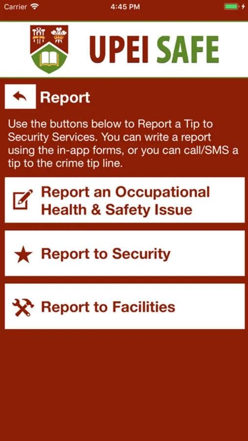 - Tip Reporting: Multiple ways to report a safety/security concern directly to UPEI security.