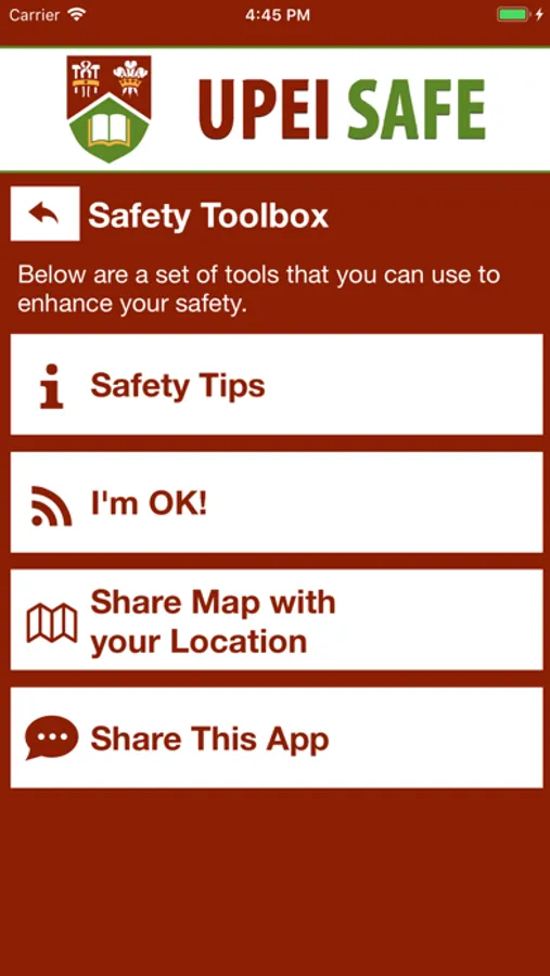 UPEI SAFE is the official safety app of University of Prince Edward Island. It is the only app that integrates with UPEI's safety and security systems. Security Services has worked to develop a unique app that provides students, faculty and staff with added safety on the UPEI campus. The app will send you important safety alerts and provide instant access to campus safety resources.