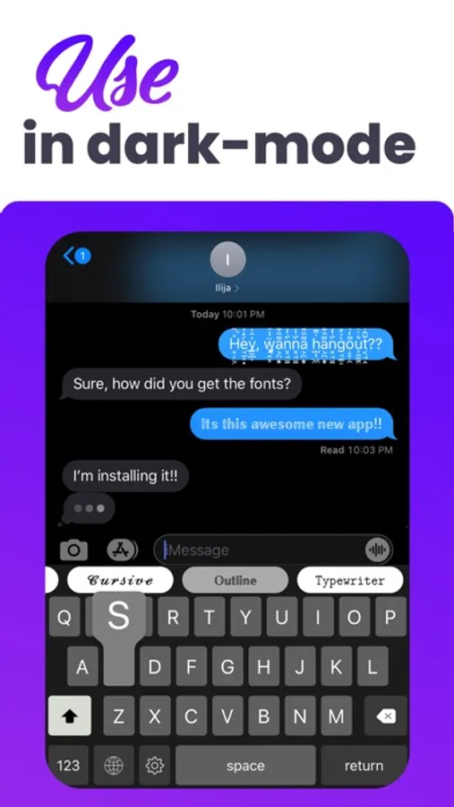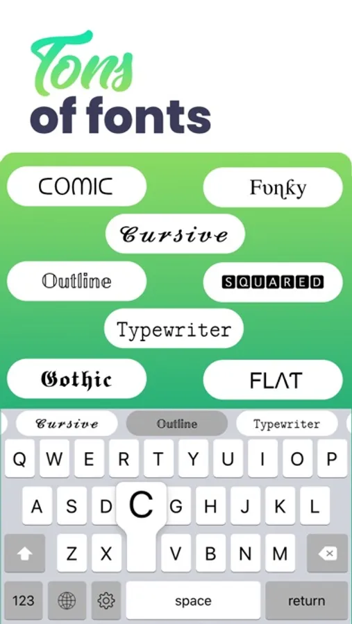 Type in dozens of fonts like Outline, Cursive, Manga, Hacker, Comic, Gothic, or make your own style. Also, enjoy hundreds of unique symbols ranging from hearts, smilies, animals, religious signs, and so much more!
