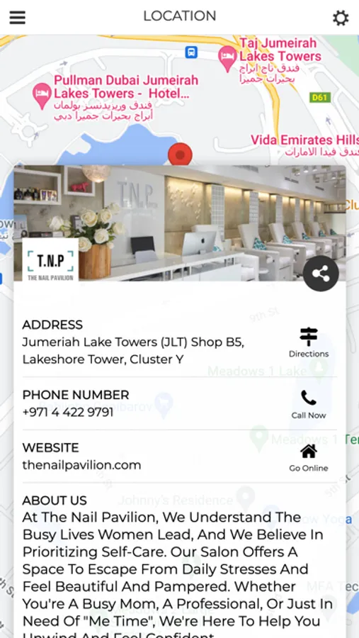 The Nail Pavilion is a beauty salon offering an extensive range of state of the art beauty services, and the latest products selected from around the world. Opened in 2014 by owner Aamna Mani, The Nail Pavilion is based in Cluster Y, JLT and has an extensive treatment list, including manicures, pedicures, waxing, eye care, massages and hair styling. The Nail Pavilion also offers at home services, at no additional cost – perfect for those who don’t have time to visit a salon or those planning a special pampering event for friends or family.