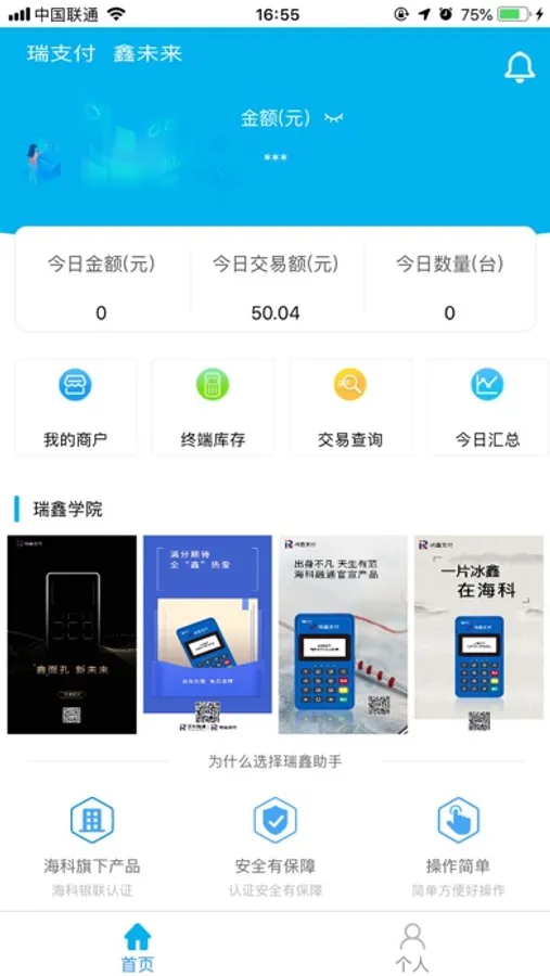 主要功能: 我的商户 终端库存 交易查询 今日汇总 实名信息 修改密码 服务专线 意见反馈 关于我们
