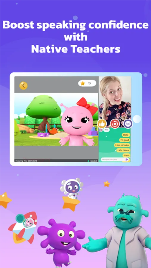 Our app is developed by curriculum and children's education specialists, making it kid-friendly and free of advertisements. Galaxy Kids is also a free-to-use English learning application. With a subscription upgrade, learners can enjoy unlimited access to the chat feature and all fun content, including videos, activities, songs, flashcards, word games, storybooks, and updates on the application.