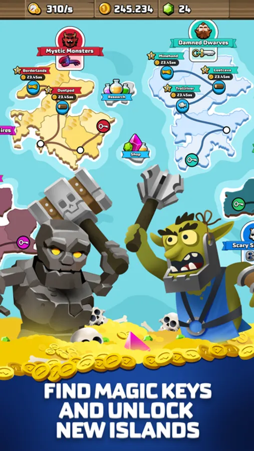Dark Dungeons, evil enemies, and other unique troops are waiting for you! Play actively as a hero or choose to automate your workflow and collect idle income, even when you are offline! No need to tap like in an online clicker simulator! Enjoy this addicting tycoon simulation game and level up!
