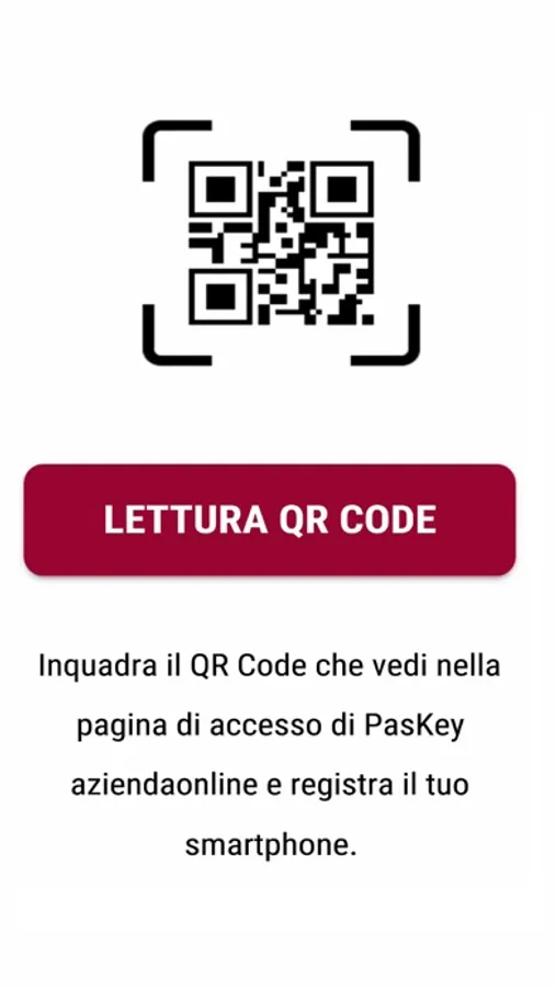 L’App consente di utilizzare il tuo smartphone dotato di fotocamera per il riconoscimento del codice QR per generare i codici monouso necessari ad operare con PasKey aziendaonline. I codici monouso vengono generati (anche offline) direttamente dall’App, sia per l’accesso che per la firma di operazioni dispositive.