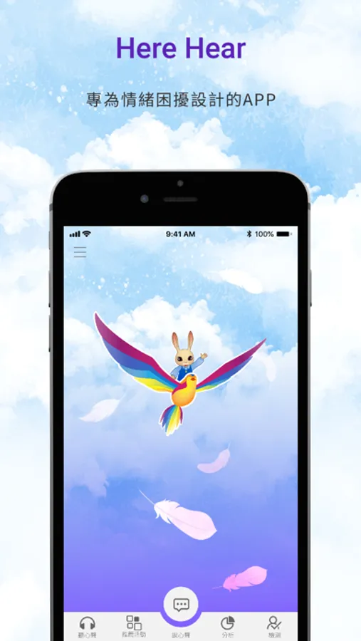 Here Hear這款隨身AI情緒神助手 APP ,運用最新情緒科技(EmoTech) 設計而成,能緩解日常生活中常見的情緒困擾,包含以下特色功能: