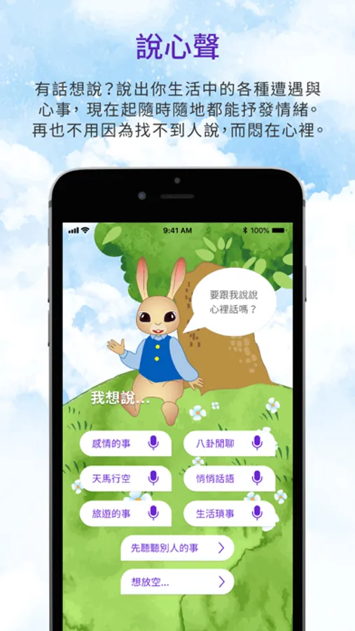 1. 說心聲:有話想說?說出你生活中的各種遭遇與心事, 現在起隨時隨地都能抒發情緒。再也不用因為找不到人說,而悶在心裡。
