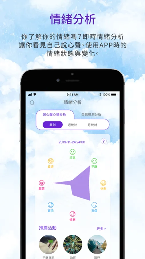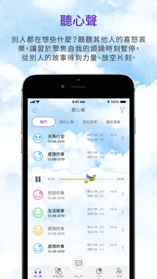 4. 情緒分析:你了解你的情緒嗎?即時情緒分析運用「 AI 聲紋情緒辨識演算法」,運算使用者錄製的聲音檔,讓你看見自己說心聲時的「即時」情緒狀態與變化。心情看的見,情緒的改善呈現在你眼前。