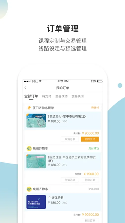 2.上传、展示商家的课程,各个研学旅行机构可自行策划、上传课程,进行线上交易;