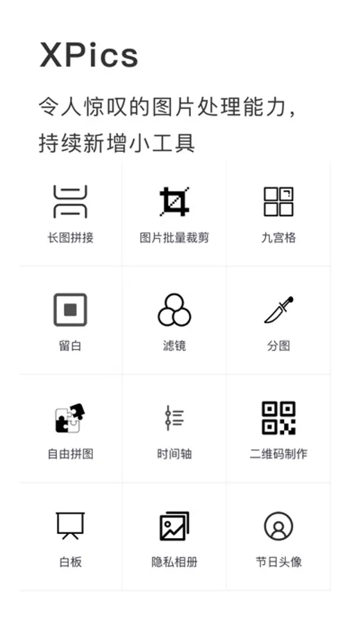 XPics is an amazing image processing software. Functions include: long picture stitching, batch cropping pictures, filter, nine-square grid, split picture, blank, two-dimensional code production, whiteboard, private photo album, holiday avatar and other functions.