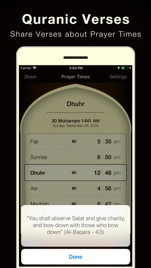 • Shows Prayer times for: Fajr, Ishraaq, Dhuhr, Asr, Maghrib, Isha.