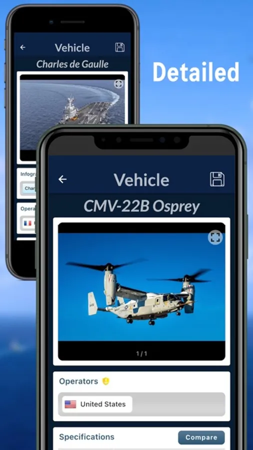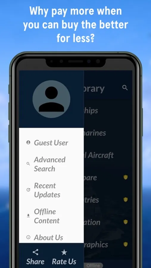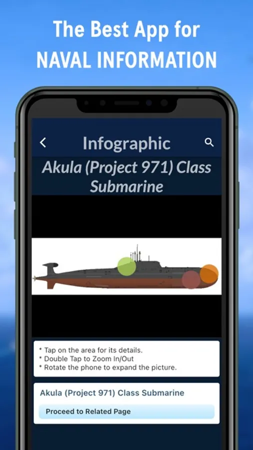 The app has twelve sections, of which eight are only offered to Pro users. These paid contents are "Interactive Infographics, Unmanned Systems, Missiles, Weapons, Equipment, Quiz, Compare and Countries" With the subscription, the user will also have the ability to use the software without an internet connection. Users will access the specifications of Warships, Submarines, Naval Aircraft and News for free.
