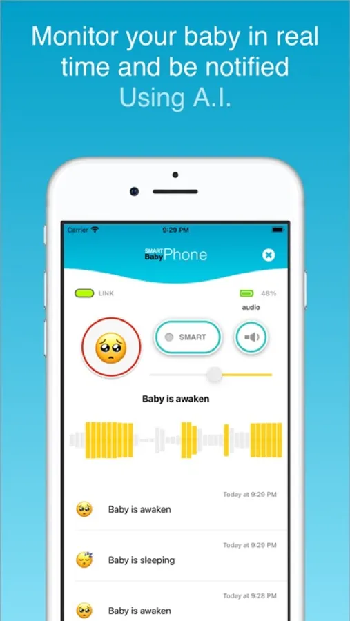 Now, with the "Smart" feature using Artificial Intelligence, Smart Babyphone can determine if your baby is just awaken or if he is crying.
