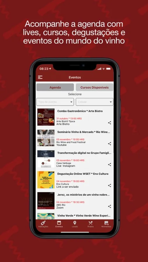 Na “Agenda”, reunimos os cursos, eventos, lives, degustações, webnars e formações que acontecem durante todo o ano, nos ajudando a ficarmos cada vez mais próximos desse incrível universo do vinho.