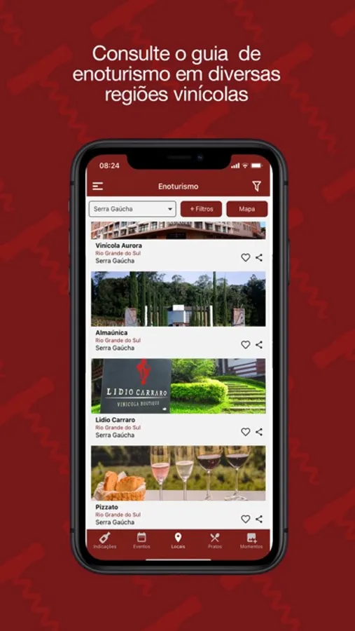 A sessão “Locais” é onde você deve clicar para conferir um guia completo de enoturismo, com mais e 130 vinícolas cadastradas, além de lista de winebars e champanherias em diversas cidades do Brasil.