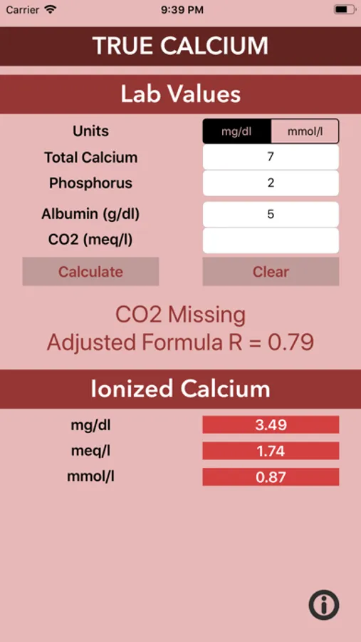 The calculator gives an accurate value of ionized calcium by introducing: total calcium, albumin, phosphorus and CO2. The performance of the calculator will depend on the amount of variables computed and will be represented with “R”.