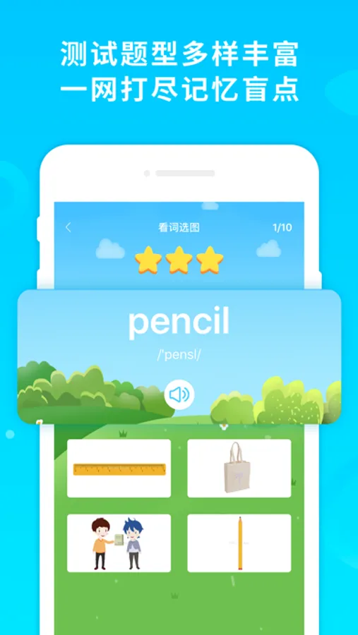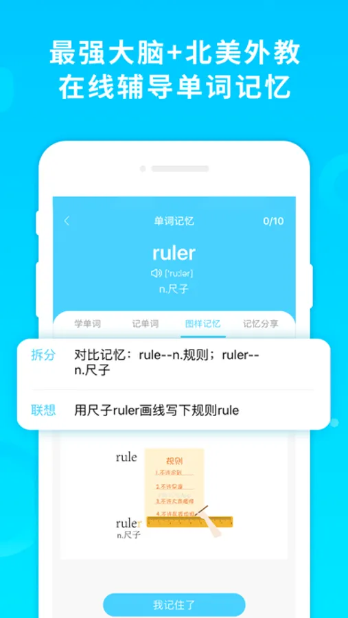 酷记忆采用生动有趣的图样联想记忆法和科学实用的记忆复习算法,将学习的知识以生动有趣的图像或视频的形式呈现,每个单词都有外教讲解发音、自然拼读和英语释义以及句子应用,每个单词也都有世界记忆大师的讲解和配图,并且基于记忆遗忘曲线研发出科学的记忆复习算法,轻轻松松看图看视频就记牢了单词和知识点。