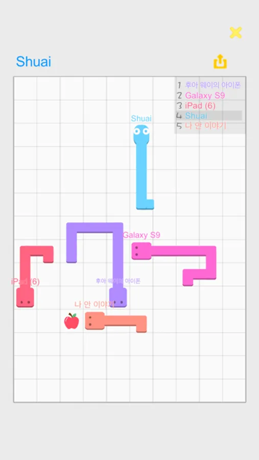 Battle mode: Two players start with a short snake. Eat the fallen apples or props, and then create various difficulties for the opponent player to defeat the opponent.