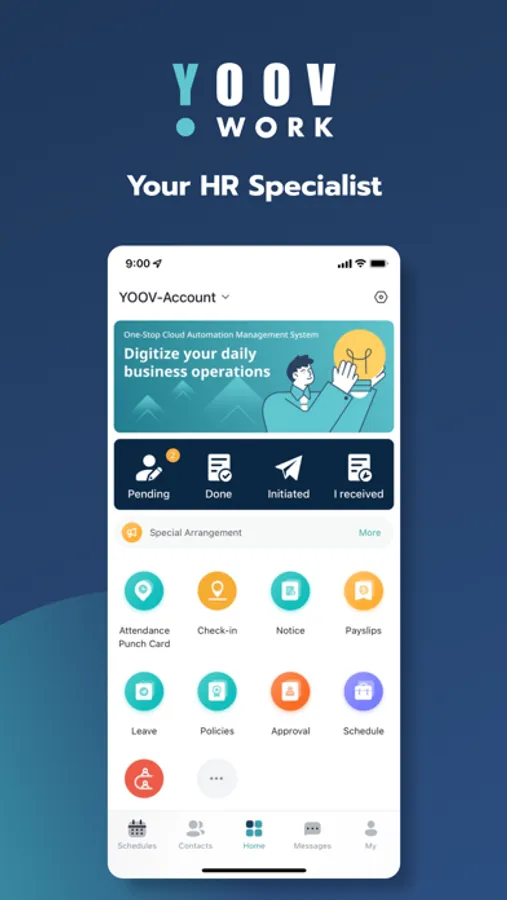 YOOV WORK is an all-rounded HR management and workflow approval system, simplifying the repetitive daily routine and unleashing hidden efficiency. Our automation system progresses your work, providing clear analytic charts for employee management. Free you from the trivial matters. Over 11,000 clients and partners trust YOOV on management.