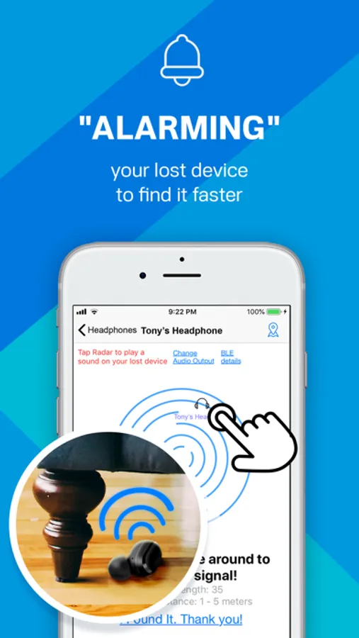 When the signal strength is high, but you still can't see your headphone, you can use the app to play a sound alarm on your lost headphone so you can follow the sound. This help you find your lost headphone faster and more easily than just randomly looking around.