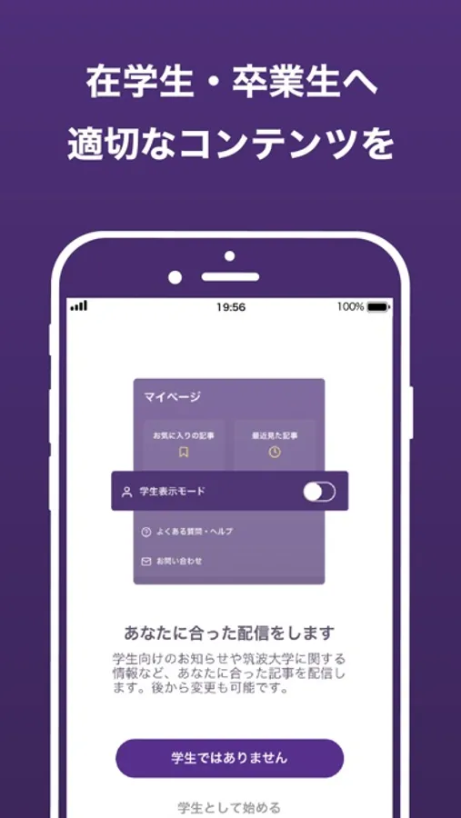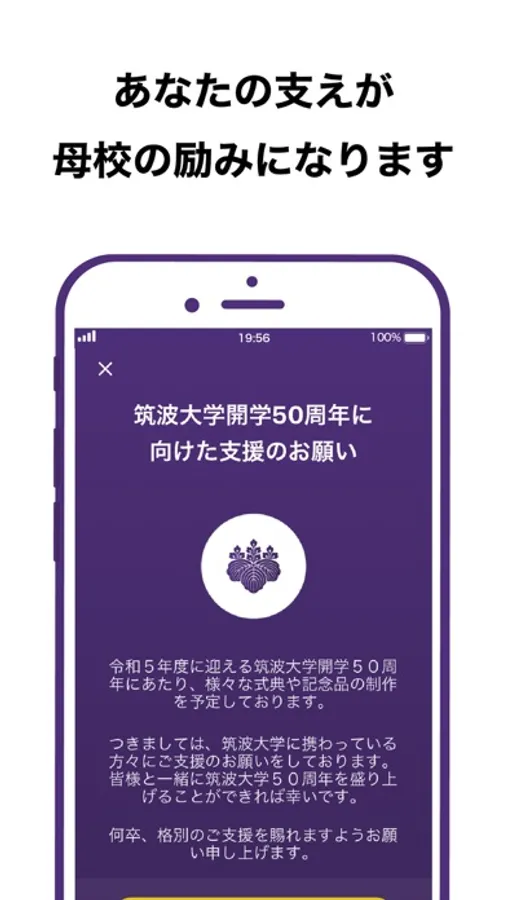 もし、アプリを通じて筑波大学を思い出せたとき、50周年の寄附が目に入ると思います。