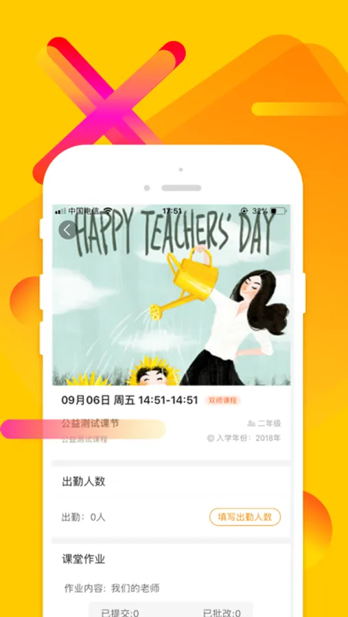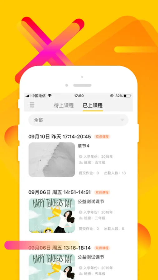 公益学校的老师可以通过登陆X美院公益版APP进行课程信息的查看、出勤信息的提交、课程作业的提交、以及学校对上课请假申请的提交。
