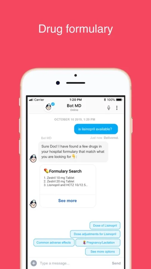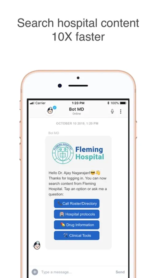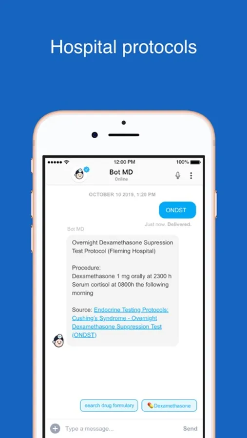 Use Bot MD to get instant answers to clinical questions on hospital specific content such as call rosters, directory information, drug formularies, hospital protocols and more. Bot MD can also automatically transcribe your dictated notes.