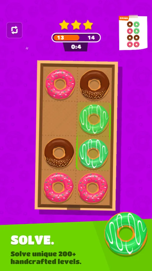 Donuts Delivery takes you through 200 of power-packed fun levels where you swipe away in all directions to bring the donuts to their correct position in the box. These donuts though, won't make your task easy. Some of them have a ticking firecracker ! some of them shuffle the whole box, some of them are coupled and move together, others are too stubborn to move!