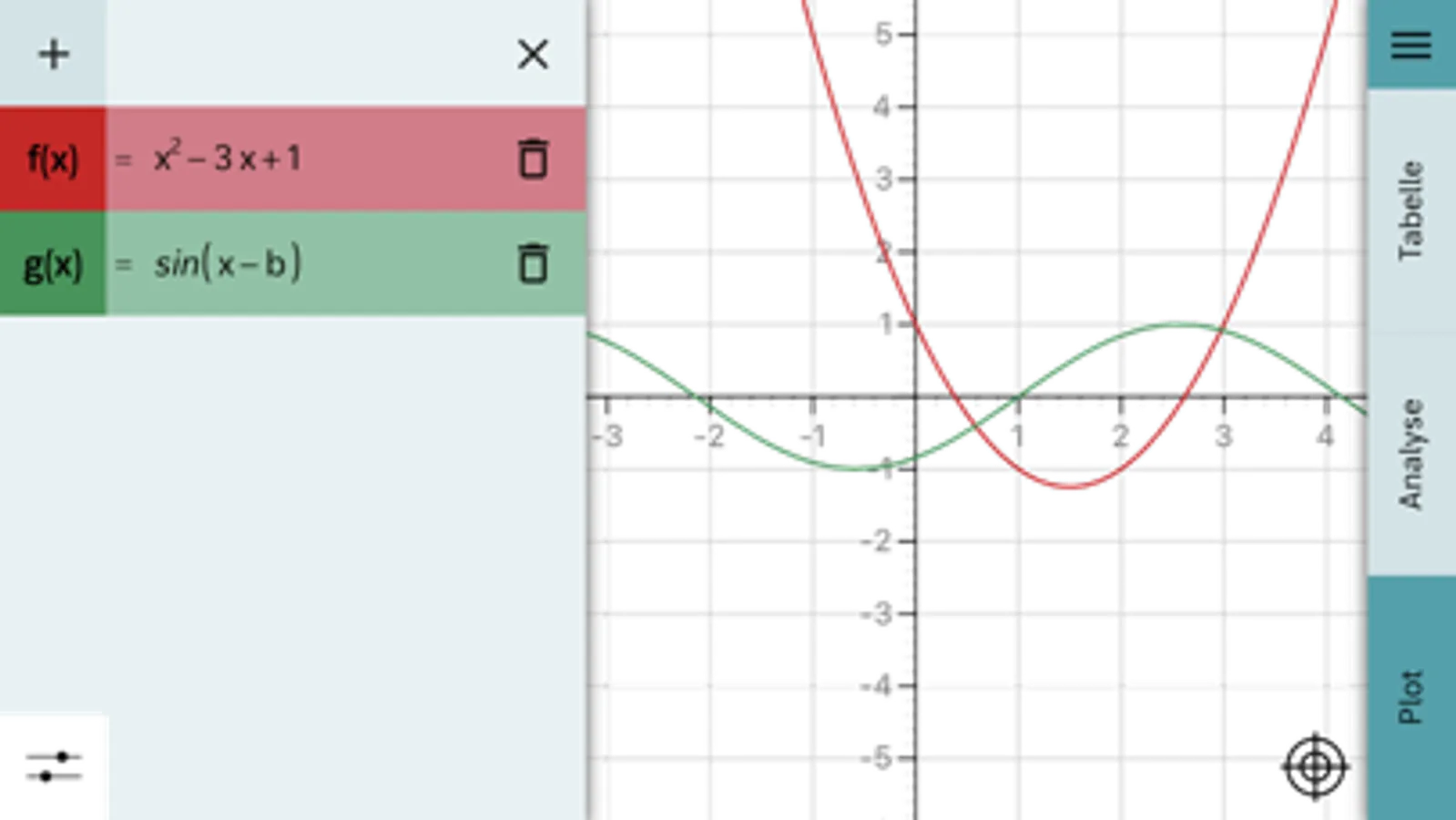 Im Funktionenplotter lassen sich Funktionen kinderleicht anlegen, plotten, analysieren und in Funktionswerttabellen darstellen. Ableitungen an der Stelle, die Fläche unter einer Kurve und auch die Schnittflächen zwischen zwei Funktionen können automatisch angezeigt werden.