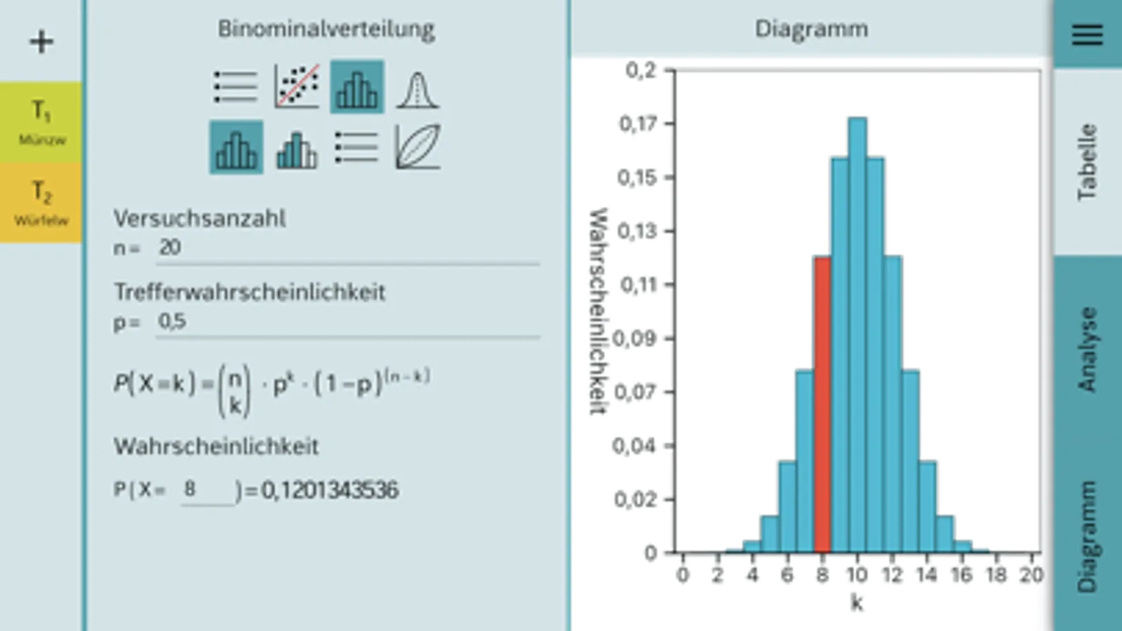 Der Statistikbereich bietet neben einer übersichtlichen Darstellung von Tabellen die Auswahl zahlreicher Diagrammarten und einen klar strukturierten Analysebereich, der neben der deskriptiven Statistik unterschiedliche Regressionsansätze und Binomial- sowie Normalverteilungen beinhaltet.