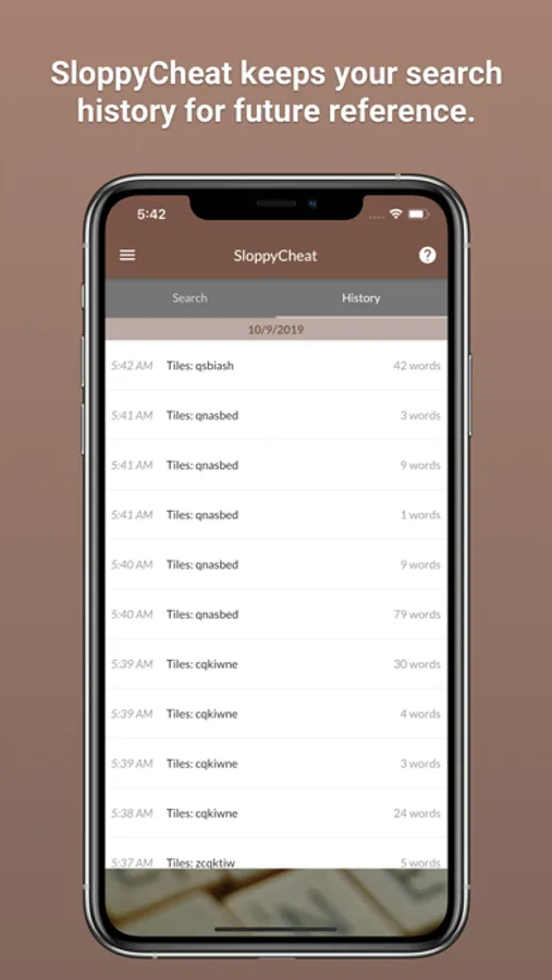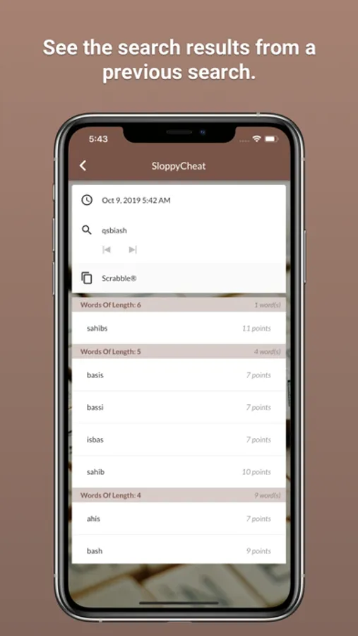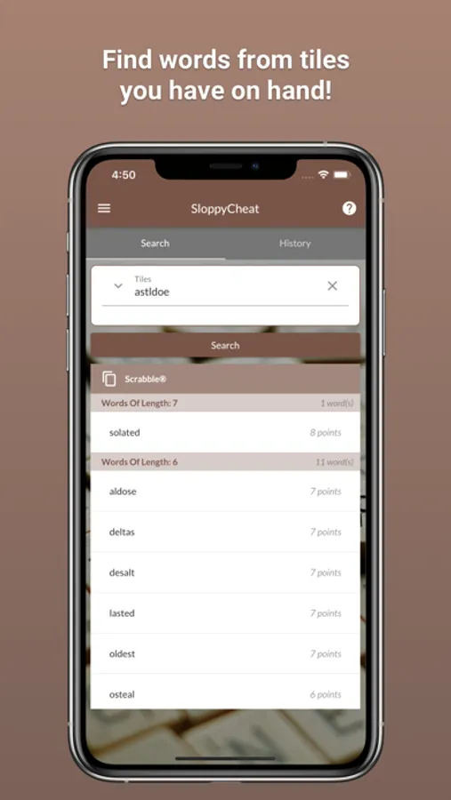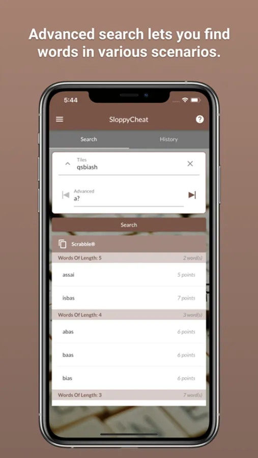 SloppyCheat is a word searcher and anagram solver. It's great for word games like Scrabble®, Word with Friends, Word Chums, etc. In addition, SloppyCheat also saves your searches so you can reference them in the future.