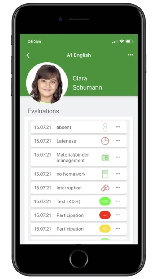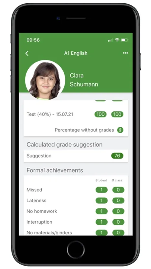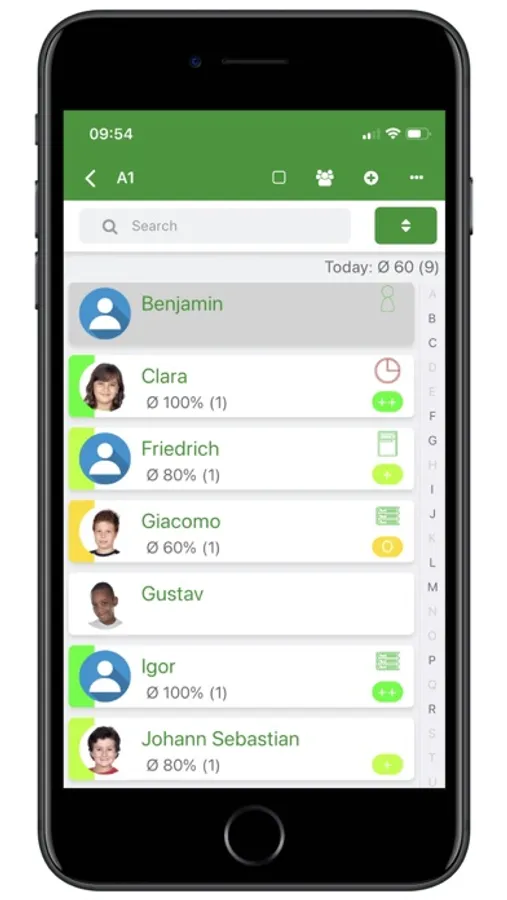 A lesson begins when a class is opened and a student is entered. All entries are simply saved with the current date. Also, grades do not have to be created beforehand for the evaluation of the participation - they can be entered directly. Other teaching services, such as a vocabulary test, are defined once and can then be used multiple times for grade entries.