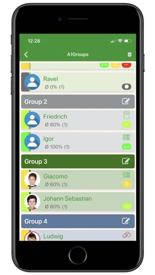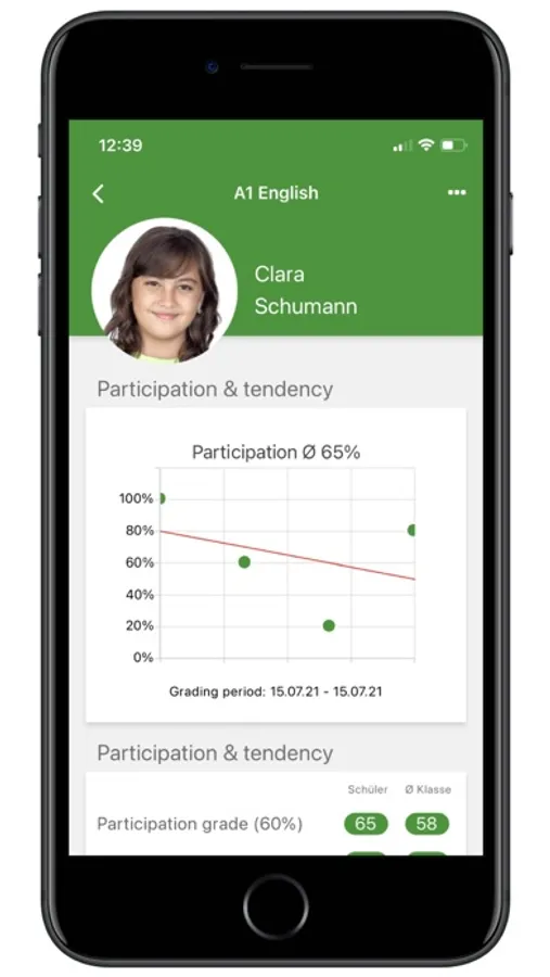 Entries can be made for several students at the same time. The serial input is available for the systematic evaluation of the cooperation. A group assistant puts together groups that are homogeneous in terms of performance and facilitates the organisation of lessons during group work. All entries can also be made in the seating plan. FlixGrade the teacher app calculates a grade suggestion based on the selected grading system or in percentages (default). Seven grading systems are created. In addition, you can define your own grading systems. The tendency of the participation grades is clearly shown with a regression line. The course of the lesson and important information are clearly displayed in the teacher calendar for the current day of the lesson.