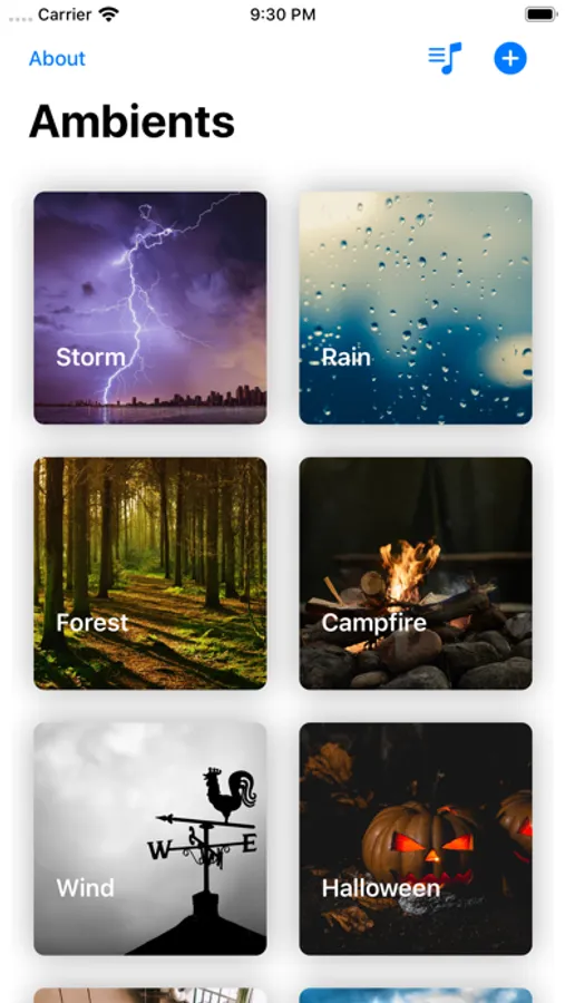 Rain, Thunderstorm, Wind, Forest with Birds, Water stream, Seaside with relaxing waves, Campfire, Fan, Rumbling Train, Coffee Shop, White Noise from Deep Space, Halloween thriller ambient sound, village at night, Wind Chimes, etc.