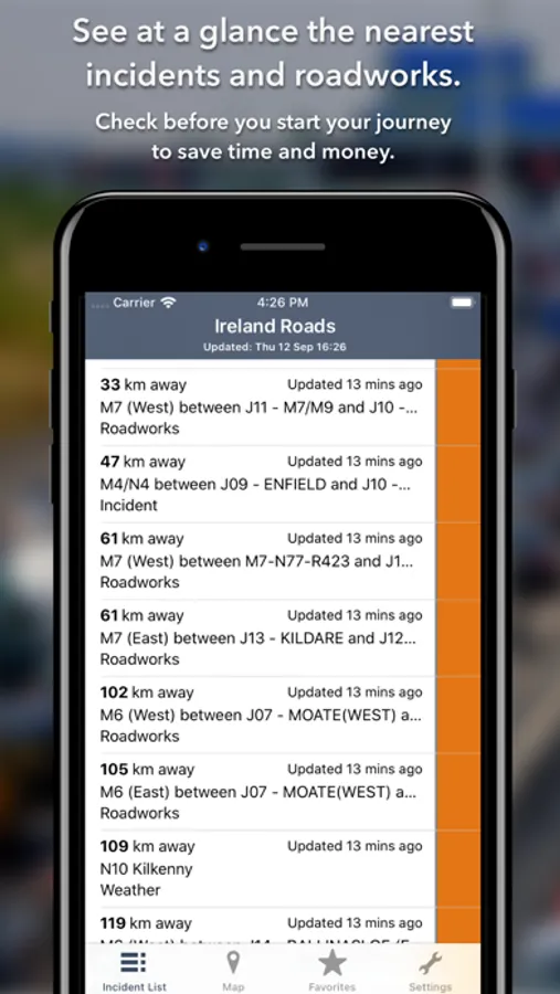- You can quickly see the distance the incident is from you, the road name and the type of incident.