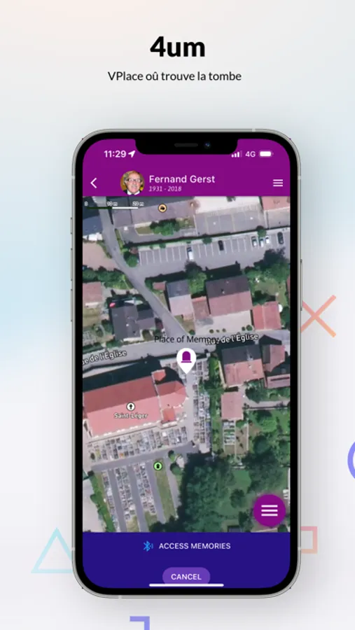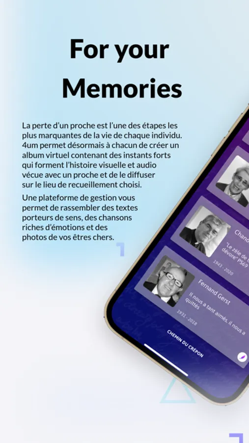 Grâce à l’App 4um, ces souvenirs deviennent accessibles aux visiteurs, mais seulement à proximité immédiate de la tombe, du lieu de souvenir et de pèlerinage que vous aurez choisi.