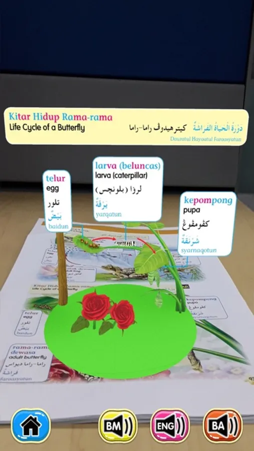 Kamus Bergambar Pelangi dengan AR menjadikan pembelajaran lebih dinamik dengan penggunaan teknologi AR. Imbas gambar terpilih pada halaman yang mengandungi ikon AR untuk melihat animasi gambar 3D yang menarik.