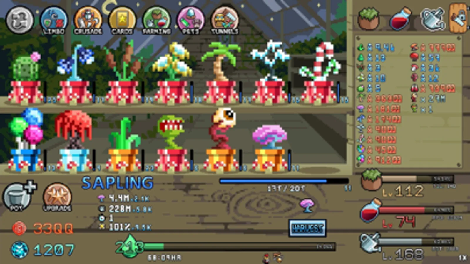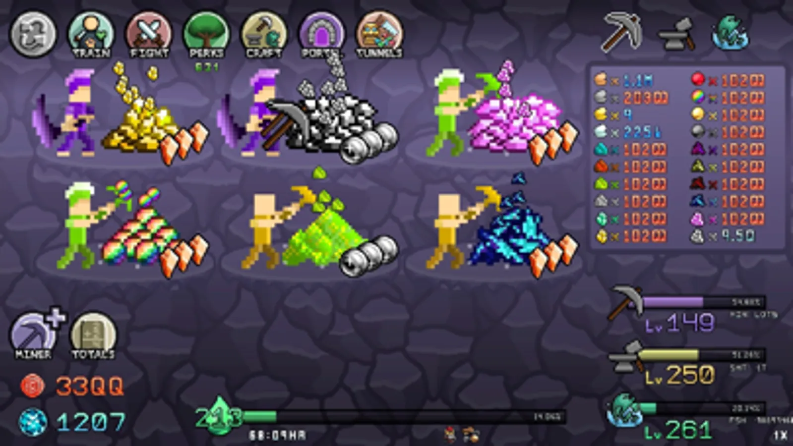 Idle Skilling has mining, fishing, crafting, pet breeding, pet battling, lab research, soul farming, regular farming, flower growing, potion making, relic upgrading...